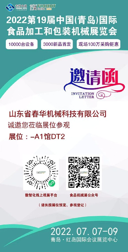 2022第19屆中國(青島)國際食品加工和包裝機械展覽會時間:2022.07.07-09展位號:-A1館DT2…