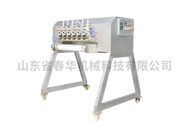 多頭夾心蟹排成型機是取代原有人工成型模式的一款新型設備,配合多臺泵浦機或者齒輪供料機,通過連接管道輸送、色漿組合成型、輥筒壓制而成,同時變頻調速,運行穩定,花色分明,成型后蟹排直接進入隧道式蒸線,生產出來的產品表面光滑、順暢。