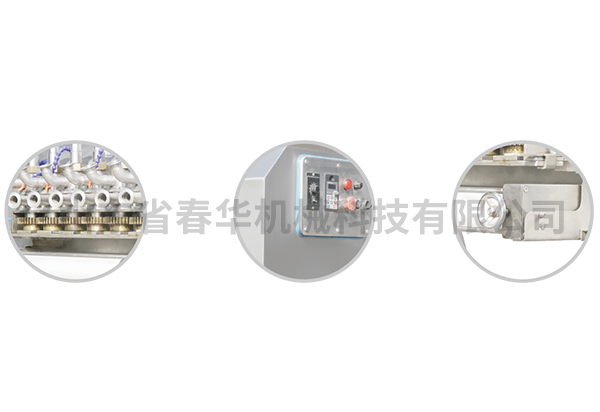 該機采用PLC程序控制、人機界面操作系統,使機器操作更人性化。同食品接觸部位均采用食品級不銹鋼制作。該機有自動著色功能、成型完的蟹排可直接進入蒸箱生產線,取代原有的覆膜著色成型技術,減少了化學材料對食品的污染,且操作方便。該機不但可以生產蟹排,還可以生產其它條狀類魚制品和肉制品,如淡水丸、包芯墨魚條、梅花條、魚排、魚豆腐等,我公司還可以根據客戶需求,提供與此機配套的模具設計和制作。